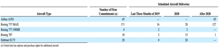 截止到2019年9月30日,美联航从波音公司(“波音”)、空客公司(“空客”)和巴西航空工业公司(“Embraer”)购买飞机的承诺和选择如下表所示: