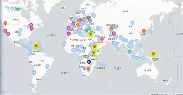 可以看出,中兴在全球范围内建设了很多基站(蓝色和黄色基站图标),同时,还有不少研发实验室(15个),5G网络项目也有17个。