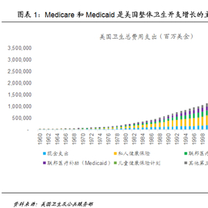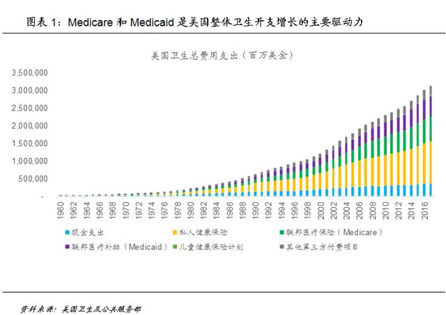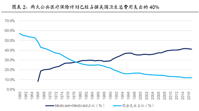 美国的医疗保险制度主要分为公共医疗保险和私人医疗保险两大部分,其中政府主导的公共医疗保险主要包括1965年建立的老年和残障健康保险(Medicare)和医疗补助(Medicaid),其中前者主要面向65岁以上的老年人群和符合一定条件的65岁以下残疾人或晚期肾病患者,后者主要面向低收入人群。随着两大公共医疗保险计划建立,美国整体医疗保险开支快速增长,其中Medicare和Medicaid是增长的主要驱动力。1960年美国整体卫生总支出中,患者自付部分占比达到57.2%,其他部分主要来自私人健康保险;而在两大计划建立后,1970年已经贡献了美国卫生总支出的20.8%,而患者自付部分下降到40.0%;截至2017年,Medicare和Medicaid合计贡献了美国卫生总支出的41.3%,而患者自付部分已经降低到仅有11.7%。