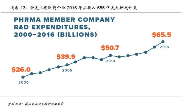 美国将改革的重心放在调整医保支付方式上,采用更加市场化的方式,降低医疗成本,药品价格并不强制降价,由于美国的药品定价更加市场化,行政管制更少,也因此通常价格更高,龙头药企盈利能力强劲,因此在研发开支上的投入也更多。根据美国药品研究和制造商协会统计,2016年全美主要医药企业共投入了655亿美元研发开支,占合计营业收入的20.4%,根据布鲁金斯研究院2015年数据,美国医药行业的研发开支占比在全世界最高;而医药行业也是美国投入研发最多的行业,2014年占据了全美所有企业研发开支的17%。