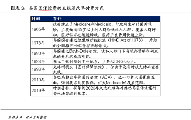 美国自1965年通过Medicare和Medicaid建立起公共医疗保险体系后,患者自付部分占比大幅降低到11.7%,而两大公共医保计划占比则提升到41.3%。上世纪70年代开始,美国开始尝试进行医保控费,总体思路是通过改革付费方式,提升医疗体系的整体资源配置效率,其中最具特色的是1973年通过的健康维护组织法。