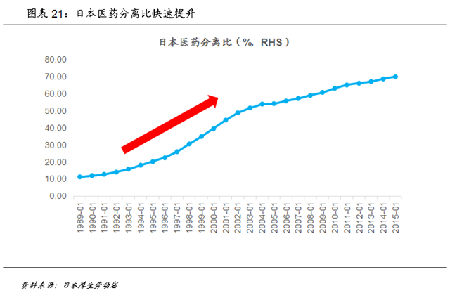 向前看,破除“以药养医”应当是中国下一步医保制度改革的关键。日本从1974年提出医药分业制度,1992年开始进行了大刀阔斧的改革,通过提升医生处方费、直接设定药品进销价差、禁止院边店的经济联系等方式,理顺了医疗机构和药企之间的利益,处方外流成为大趋势,医药分离比快速提升。