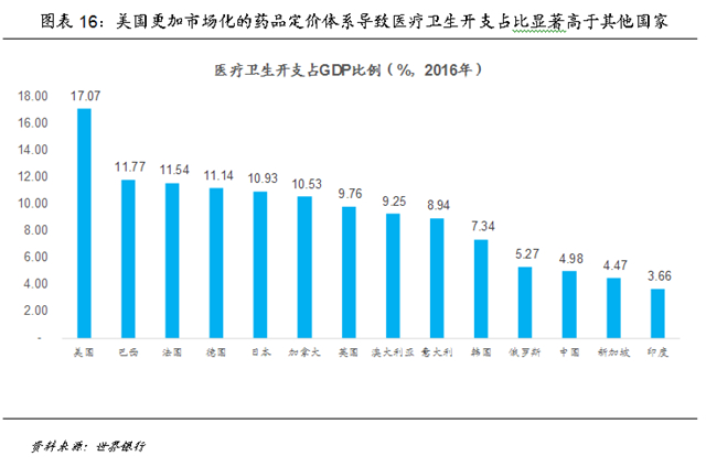 然而硬币总有两面,美国市场化的药品定价体系激励了药企的研发开支,但从最终整体医疗成本的管控效果看,美国远逊于日本和主要西欧发达经济体。2016年美国医疗卫生开支占GDP比例达到17.1%,在所有发达经济体中遥遥领先,深受人口老龄化困扰的日本也仅为10.93%,而其他发达经济体普遍在10%~11%左右。