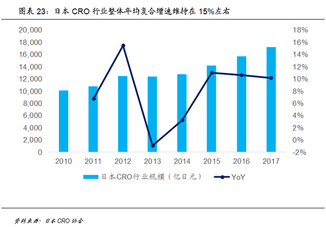 从日本经验看,在利润空间压缩、研发开支吃紧的大背景下,医药研发外包(CRO)企业蓬勃发展,由于更加专业化的分工和规模优势,CRO企业能够提升企业研发的效率、大幅降低研发成本。日本CRO行业整体规模从2000年以来年均复合增速维持在15%左右,截至2017年已经成长为一个1.7万亿日元的庞大市场。