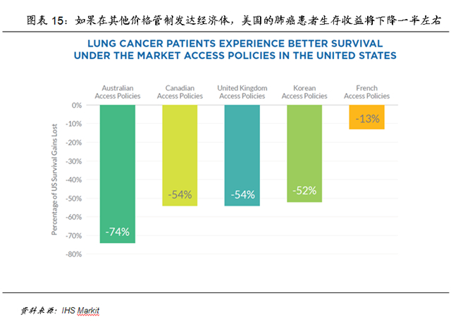较高的研发开支使得美国成为创新药的天堂。2000年以来,美国食品和药物管理局(FDA)批准通过了接近600种新药,包括治疗癌症、神经疾病和多种罕见病的全新药品。2011年以来上市的所有新药中,88%的新药在美国可以使用,而这一数字在西欧发达经济体为50%~60%,在日本为51%;从时间上看,在美国之外的发达经济体,患者需要等候更长的时间才能用上新药,例如加拿大和法国的患者平均需要比美国患者多等待14个月和19个月才能使用新药治疗。得益于更多种类的新药和更短的推出时间,美国的患者存活率也更高,根据IHS Markit数据,如果一名罹患普通肺癌的美国患者处在其他采用政府价格管制的发达经济体,例如英国、加拿大和韩国,由于新药推出较难,患者的生存收益将下降一半左右,如果在澳大利亚则将下降超过七成。