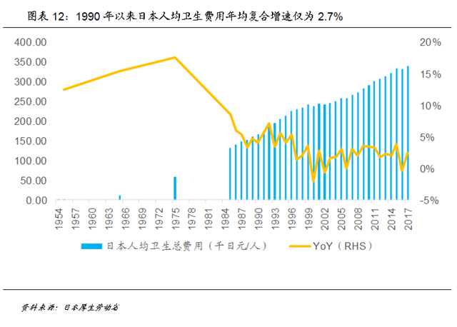 虽然老龄化大背景下,日本老年人数在不断增多,但1990年以来人均卫生费用年均复合增速仅为2.7%,而在1955~1975年之间高达15.2%。