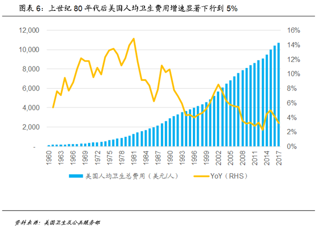 整体看,美国通过改革医疗保险支付体系,在医保控费方面取得了一定效果,上世纪80年代之后,美国人均卫生费用增速显著下降,1990年到2017年之间,美国人均卫生费用年均复合增速维持在5%的较低水平。