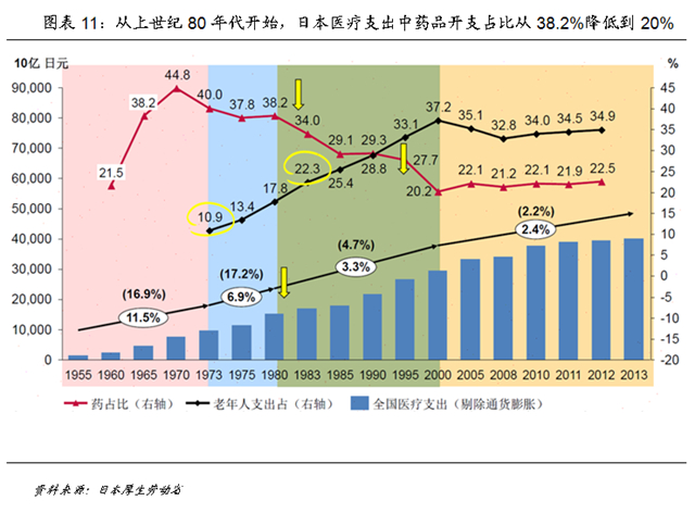 1974年,由于医疗保险开支的压力加大,医药分业制度开始提出,日本将医生处方费提升了6倍以上,但此后医疗开支中的药费占比仅仅是从44.8%降低到37.8%,从药品中赚取的差价仍然是医生和医院的主要收入来源。为理顺这一利益格局,日本厚生劳动省从1992年开始,对药品定价机制和经销体制进行了深入的改革。
