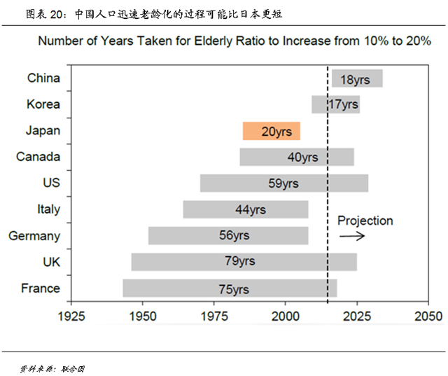 根据联合国预测,人口老龄化比例从10%提升到20%的过程中,意大利用了44年,德国用了56年,美国需要经历59年,而日本仅用了20年就完成了这一过程。对于其他亚洲经济体例如中国和韩国,需要的时间分别为18年和17年,甚至比日本老龄化的速度更快,因此中国更适合选择类似日本的路线,以有效控制老龄化带来的可能迅速提升的总体医疗费用开支。