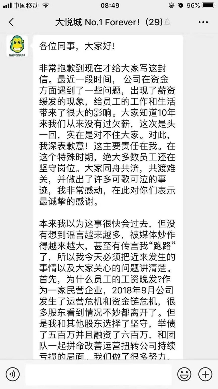 记者从员工处获悉的任重所发文章中显示,早在2018年9月,公司就发生了运营危机和资金链危机,很多股东看到情况不妙都离开了,但他(任重)和其他股东选择了坚守,举债了五百万并且融资了六百万。
