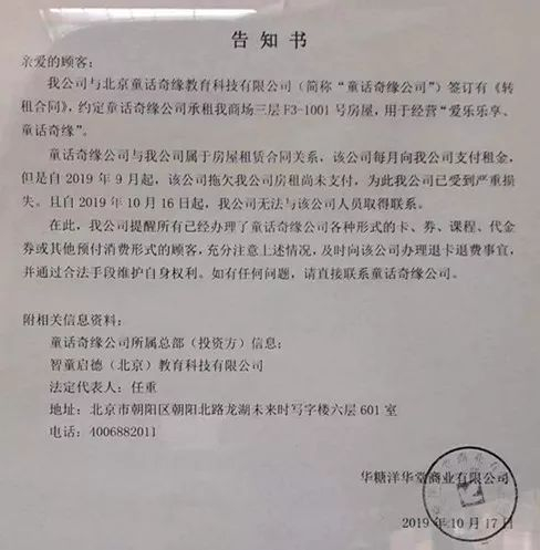 华堂商场和在“童话奇缘”供职的老师也在寻找该机构方及法定代表人任重。10月17日,华堂商场贴出一份告知书,表示16日起无法联系上童话奇缘所属公司,该公司自今年9月起开始拖欠房租。