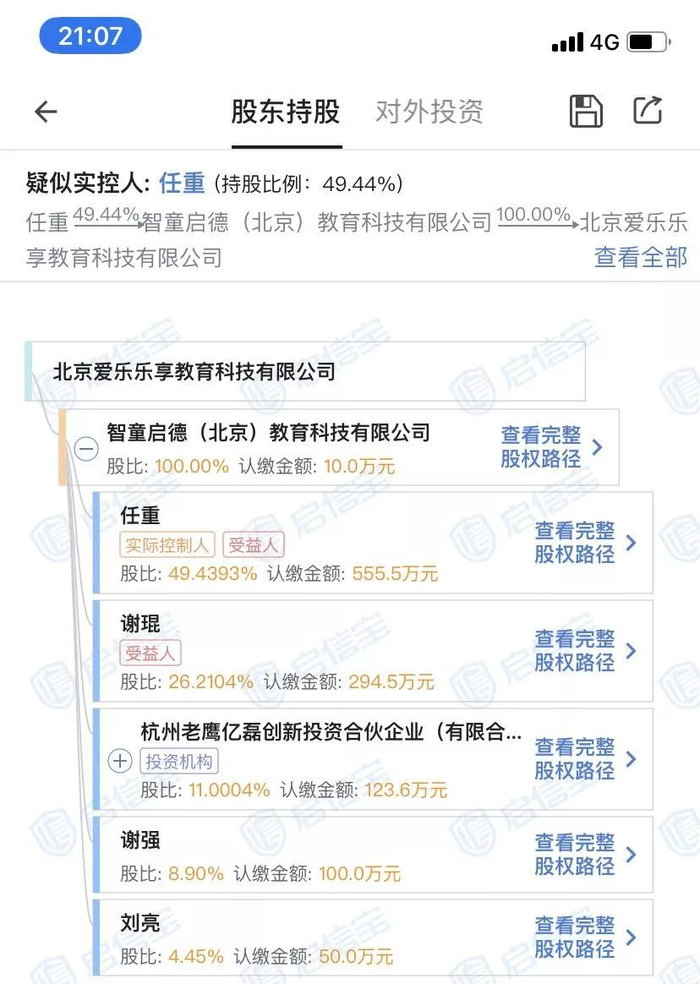 据启信宝显示,北京爱乐乐享教育科技有限公司由智童启德(北京)教育科技有限公司100%控股,两家企业法定代表人均为任重,而爱乐乐享官网所显示的版权所有方,正是智童启德(北京)教育科技有限公司。而由任重担任法定代表人的企业共有7家,多和早教相关。其中智童启德成立于2014年,注册资本超过1000万。
