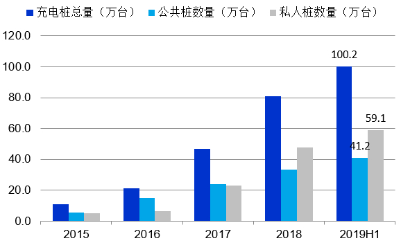 而充电桩的数量在其拉动下,从2015年的10.7万台连续增长至2019年6月底的100.2万台。