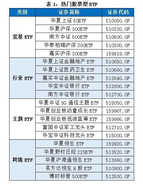 宽基ETF跟踪的是宽基指数,在流动性、风险分散上均占据绝对优势,百亿规模以上的ETF也多出现在宽基ETF领域(不考虑货币ETF);行业ETF聚焦于一类行业,是把握行业轮动的上乘之选;主题ETF集中精力投资于某一类主题的ETF;跨境ETF则是以境外资本市场证券构成的境外市场指数为跟踪标的。