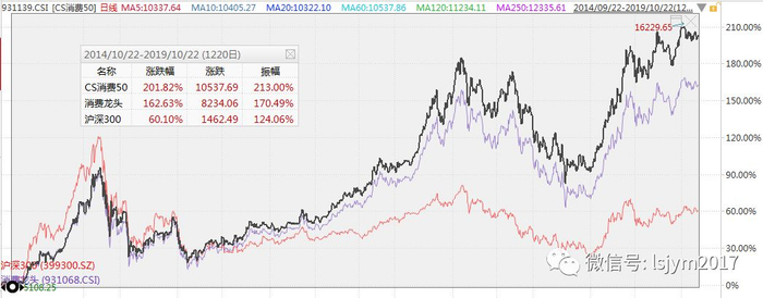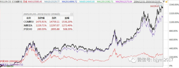 我们再来对比一下最长时间周期的表现。wind数据显示,截至2019年10月22日,中证消费50自基日以来累计上涨1475.91%,中证消费龙头上涨1229.71%。同期,上证指数涨幅为289.59%。近15年的长跑,中证消费50指数大幅领先,涨幅是同期沪深300指数的5倍!涨幅比中证消费龙头高了246.2%。