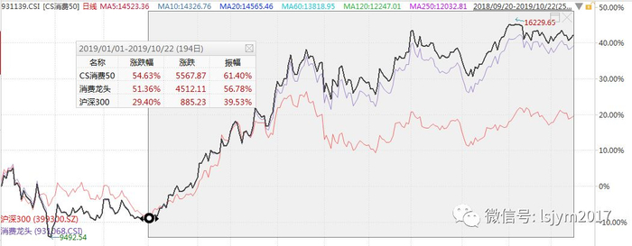 从2019年涨幅来看,截止到10月22日,中证消费50累计上涨54.63%,中证消费龙头指数上涨51.36%。同期,沪深300指数上涨29.4%。两大指数均轻松跑赢沪深300,中证消费50指数表现更为出色。