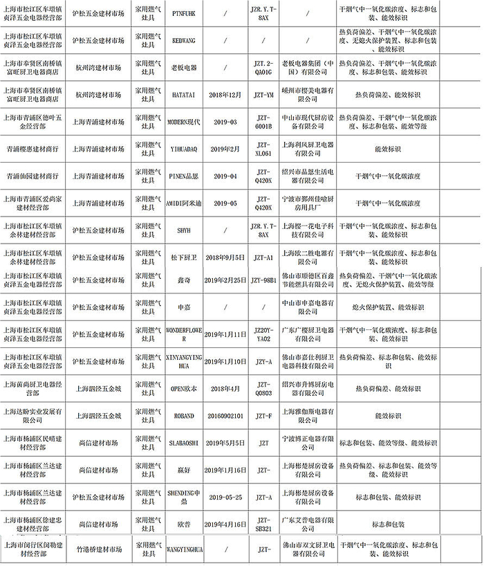 其中,干烟气中一氧化碳浓度超标的有11批次不合格,包括松下厨卫、PINEN品恩、AMIDI阿米迪、PTNFUHK等品牌。热负荷不合格的有7批次,涉及OPEN欧本、赢好等品牌。熄火保护装置不合格的有3批次,均为无熄火保护装置,涉及鑫奇、申嘉等品牌。标志和包装不合格的有13批次,其中包括欧普。