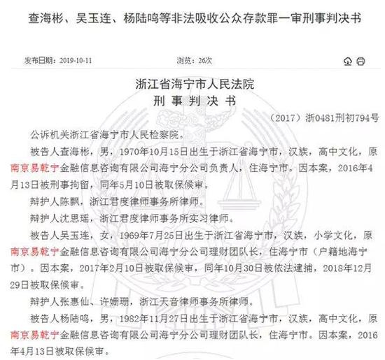 易乾财富各地分公司负责人日前相继被判刑