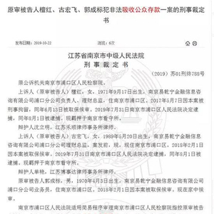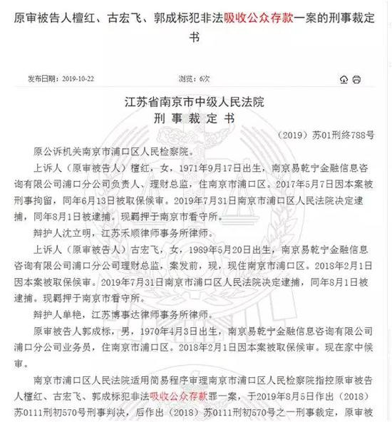 裁判文书网10月22日披露的一则刑事裁定书显示,南京易乾宁金融信息咨询有限公司浦口分公司负责人檀红的行为构成非法吸收公众存款罪,被判有期徒刑两年十个月,并处罚金人民币8万元。与此同时,该分公司的理财总监古宏飞被判有期徒刑两年,并处罚金人民币6万元,业务员郭成标被判有期徒刑七个月,缓刑一年,并处罚金人民币5万元。