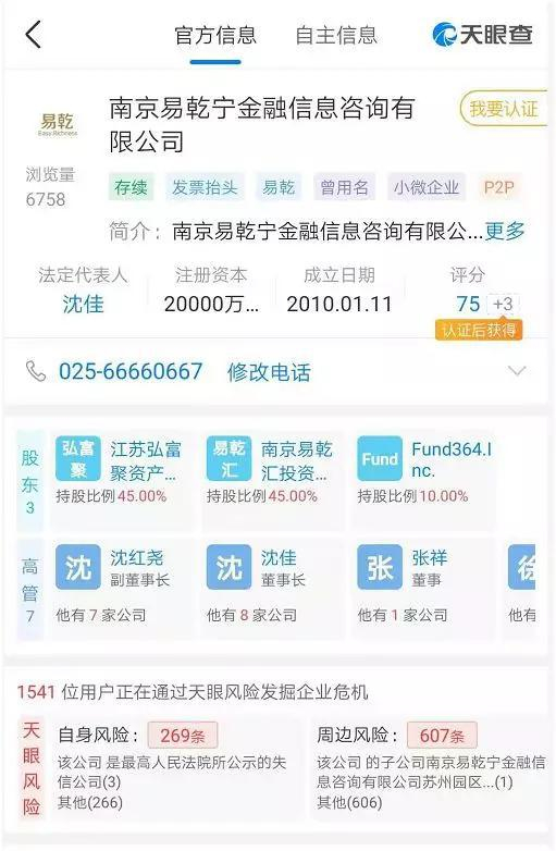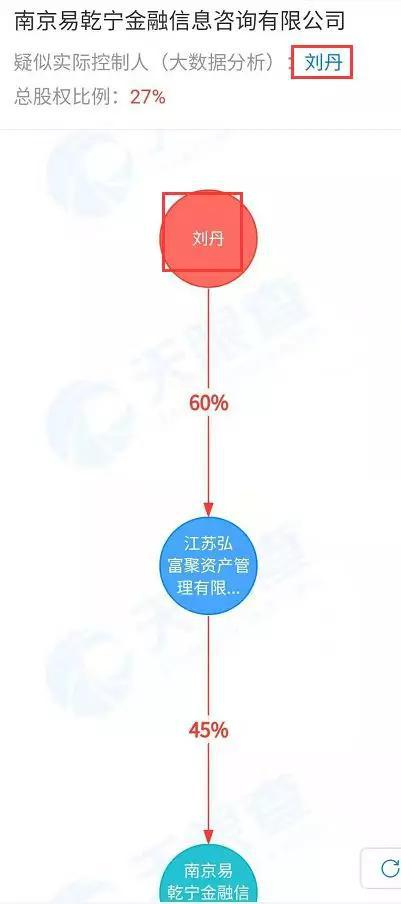 天眼查的资料显示,南京易乾宁金融信息咨询有限公司(易乾财富)成立于2010年,总部位于南京,注册资本为2亿元,法人为沈佳,疑似实际控制人为刘丹。