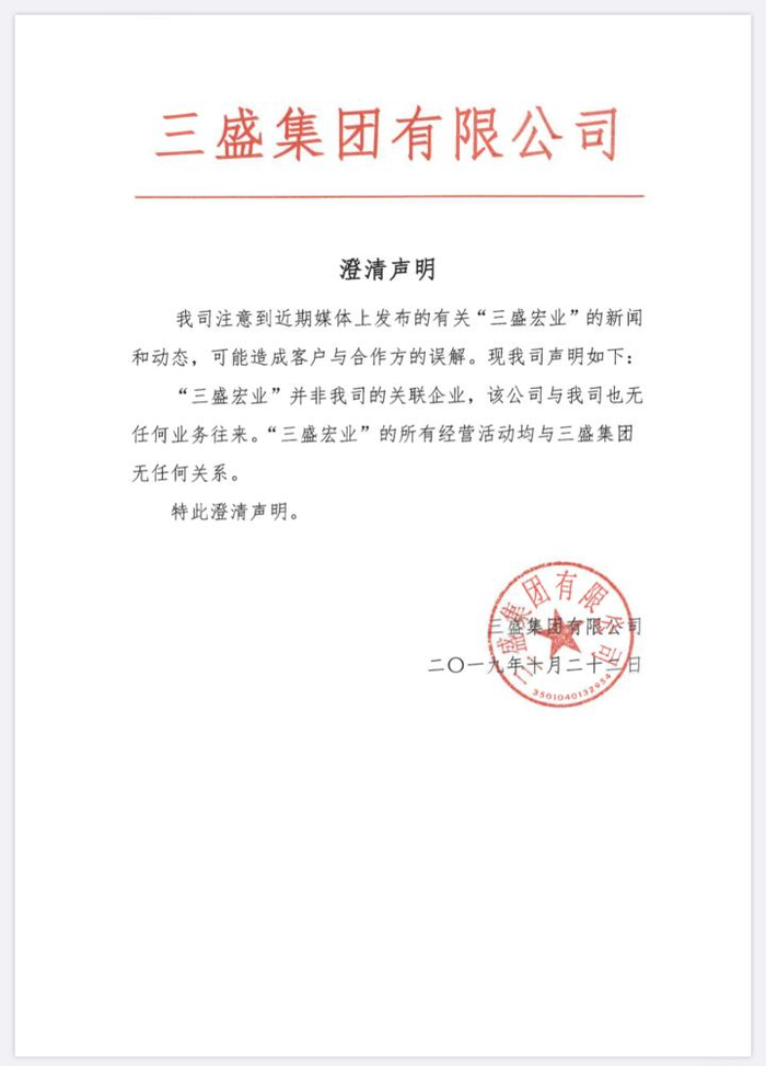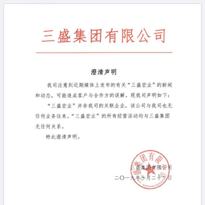 答:我司近期也注意到了媒体上发布的有关“三盛宏业”的新闻和动态,并一定程度上造成了对我司客户与合作方的误解。
