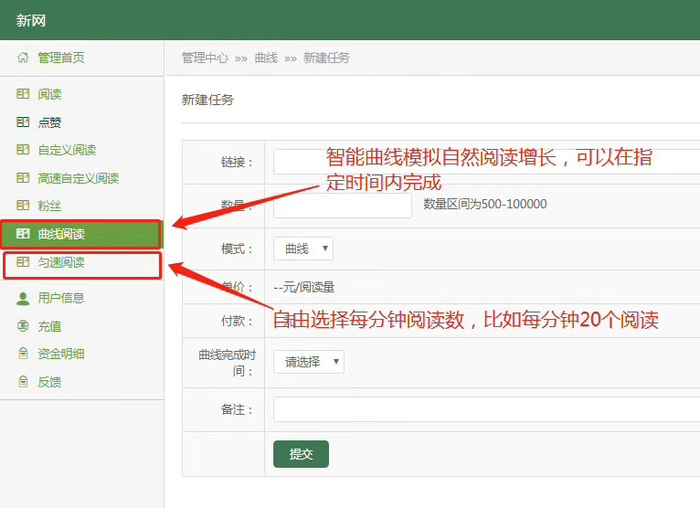 新网平台左侧管理首页,分为阅读、点赞、粉丝、曲线阅读、匀速阅读、用户信息、充值等微信公众号刷量服务栏目,客户可以根据自身需要进行选择。