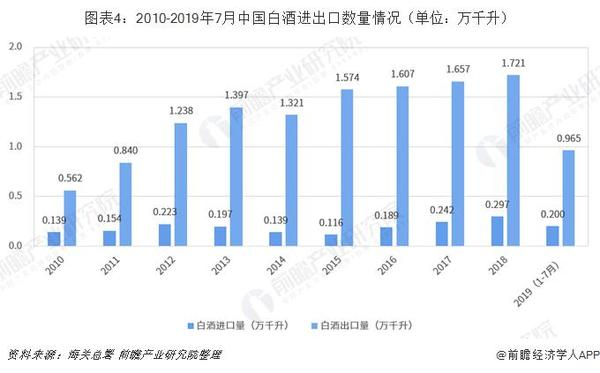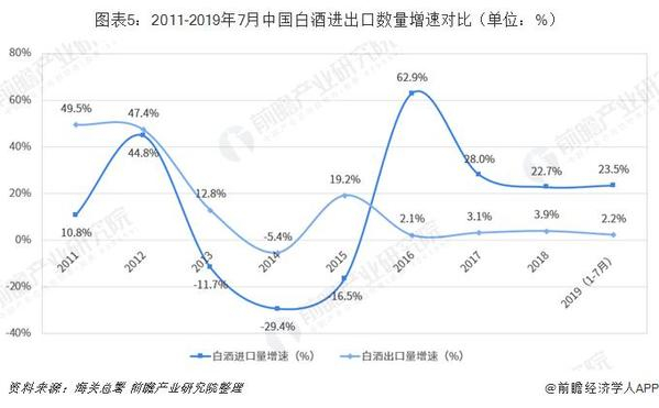 从白酒销量来看,销量变化特征与产量基本一致,但在2019年上半年,中国白酒销量继续大幅下滑,同比减少了20.7%,主要原因是国内经济发展放缓,导致白酒消费疲软。