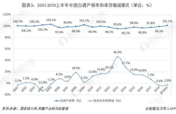 从白酒产销率来看,2001-2019上半年,白酒行业产销率均保持在95%以上,其中,2012-2018年白酒产销率均在100%以下,2019上半年再次回升至100%以上,达101.1%。而结合产销率分析,近两年白酒产量下降的原因之一是:2012年后白酒产量增速超过需求,供过于求,导致部分库存,促使2017年以来部分企业考虑到清库存开始减产;而经过两年库存清理后,企业开始逐步恢复加大投产,促使2019年白酒产量开始回升。
