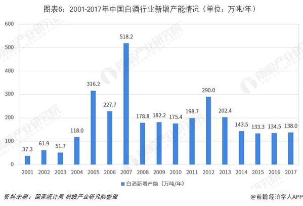因此,尽管近两年国内白酒产量有所下滑,但是国内白酒产能却持续增长,以保证长期白酒供应。具体来看,2001-2017年,中国白酒产能不断增加,但新增产能趋于理性回归。2001年至今,尽管国内白酒新增产能波动变化,但均为正值,且自2004年开始有显著增加,并在2007年创下历史峰值,当年新增产能达518.2万吨/年;但自2008年开始,白酒新增产能保持相对稳定。2015年开始,白酒年新增产能均在140万吨以下,处于近十年的较低水平,主要是因为前几年国内白酒库存增长、产能过剩,白酒生产理性回归所致。