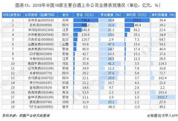 而从白酒上市企业来看,以国内主要的19家白酒上市企业为例,其中,隶属于四川省、安徽省的上市企业数量相对较多,各占4家;此外,北京、甘肃、贵州、河北、湖南、江苏、山西、新疆也拥有白酒上市公司。