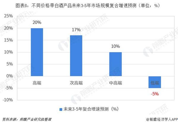 值得一提的是,尽管目前高端和次高端白酒产品的市占率不如中高端和低端产品,但是高端白酒未来更具发展潜力,主要原因是:一是白酒有较强的社交、面子属性,是社交应酬的润滑剂,尤其是极具稀缺性的高端名酒,有不可替代性;二是随着国内消费升级,高端白酒在品质、品牌上的竞争优势将日益凸显;三是高端白酒更具有收藏价值、送礼价值,更受白酒爱好者青睐。因此,有相关研究机构预测,未来3-5年,中国高端白酒规模复合增速将达到20%左右,次高端和中高端白酒增速也将保持在10%以上,而低端白酒的市场规模将被压缩。