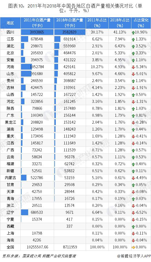 而从白酒产量占比变化趋势来看,中国白酒产业还有不断向四川省聚集的显著特征。通过对比2011年和2018年各省市白酒产量占比变化情况,发现此期间河南、山东、吉林、河北、黑龙江、内蒙古、辽宁等地区的白酒产量份额大幅下降,而四川、江苏、湖北、北京、安徽和贵州等地区的白酒产量占比明显上升,其中,四川省白酒产量占比上升最快,占比增长了10.96%。