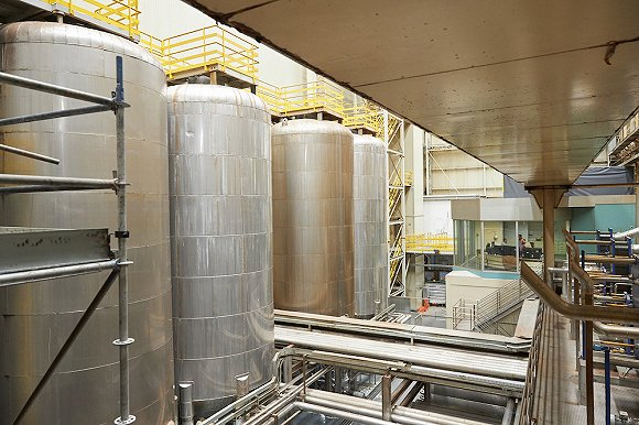 巨大的运输管道、罐装车和有近30米高、几乎能引发你“巨物恐惧症”的无氧储存罐,橙汁就像任何其他的工业原料一般被运输存储,带来一种规模化工业的震撼。当然,针对质量要求更高、生产运输要求更严苛的非浓缩还原橙汁(NFC),在鲜果榨汁经过巴氏杀菌后,即通过全程密闭管道注入低温温控的无氧储存罐。