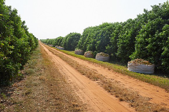 正值南半球的春季,可已经是收获的季节。巴西圣保罗州和米纳斯吉拉斯州的25个农场,在5月到来年2月,陆续进入3次采收期。7300多名采摘工人组成了185个采摘队,在四组三班倒的工作制下,每个团队每天可以采摘3000箱橙子。
