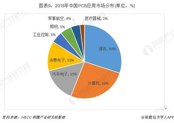 全球PCB下游应用市场分布广泛,主要包括通讯、计算机、消费电子、汽车电子、工业控制、军事航空、医疗器械等领域。根据Prismark的统计,2018年全球PCB下游应用领域分布如下: