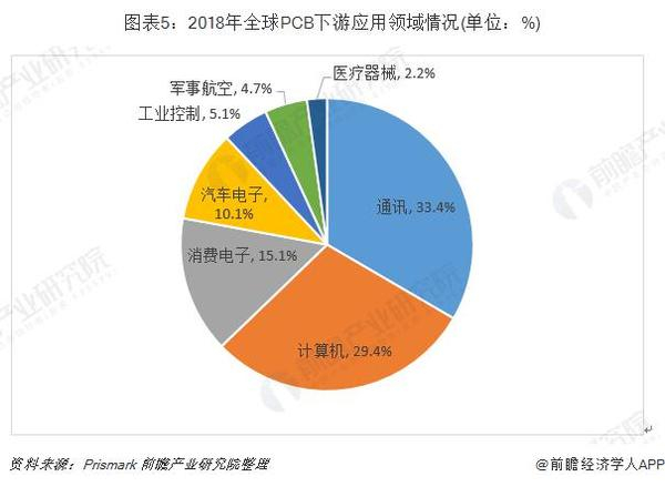电子信息产业的蓬勃发展是PCB行业发展的重要助力。从下游应用领域分布来看,2018年通讯行业的PCB市场规模最大,占比约为33.4%;其次是计算机行业,占比约为29.4%。其他领域PCB市场规模较大的是消费电子、汽车电子。