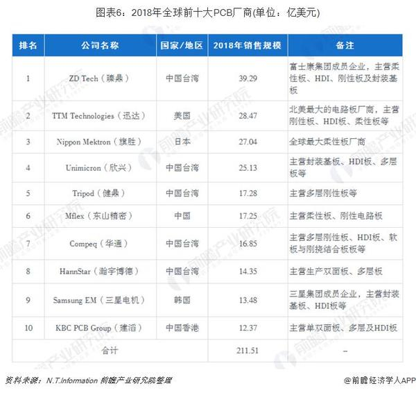 全球印刷电路板行业集中度不高,生产商众多,市场竞争充分。虽然目前PCB行业存在向优势企业集中的发展趋势,但在未来较长时期内仍将保持较为分散的行业竞争格局。根据N.T.Information发布的2018年世界百强PCB企业排行榜,2018年前十大PCB厂商收入合计为211.51亿美元。2018年全球前十大PCB厂商的销售情况如下: