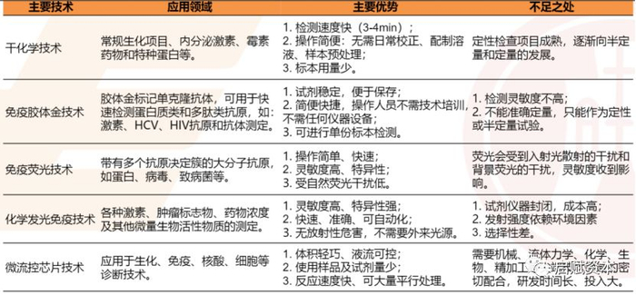 POCT技术更新速度快,技术原理主要有:干化学、胶体金、免疫荧光、微流控芯片、化学发光、生物传感器、生物芯片等。其中,干化学逐步被替代,胶体金和免疫荧光成为市场主流技术,而微流控则为未来发展的方向。以下为主要技术的对比分析: