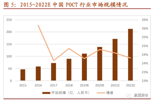 但目前国内POCT市场正处于行业周期中的快速发展阶段,2018年市场规模约为80亿元,预计到2022年行业规模将达到约200亿元,年均复合增长率接近25%。