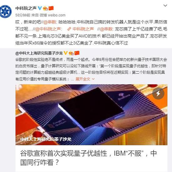 虽然这些网友质疑的义正严词,但是这一句话中连一个对的喷点都没有(龙芯经费没有这么多、兆芯的X86不是买AMD的、龙芯指令集更不是X86),而且连中科大与中科院都搞不清楚,都让人怀疑他不是纯粹的愚蠢而是故意反串了。
