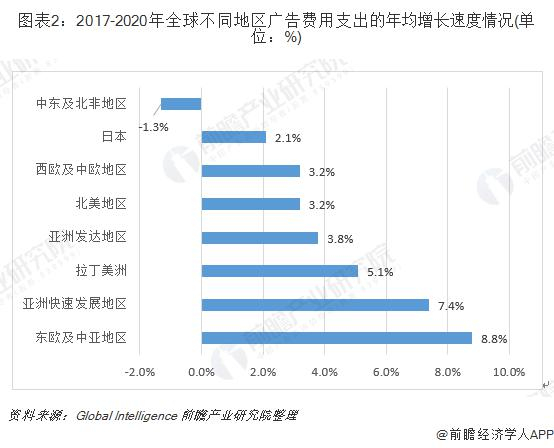 虽然全球广告市场规模总体保持不断增长的趋势,但不同地区广告费用支出的年均增速存在明显差异。根据《Global Intelligence》的预测,2017年至2020年(预测),东欧及中亚地区是全球广告费用支出增长速度最快的地区,我国所处的亚洲快速发展地区系增长速度第二的地区。