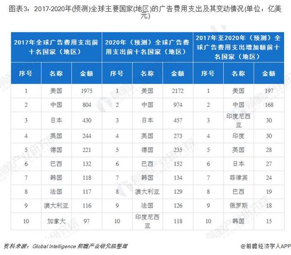 根据《Global Intelligence》的数据,2017年及2020年(预测),全球广告费用支出前十名国家的广告市场规模合计分别为4254亿美元及4768亿美元,占全球广告市场规模的比例分别为77.0%及75.8%,全球广告行业的市场集中度较高。另一方面,2017年至2020年(预测),全球广告费用支出增长最多的前十名国家的广告市场规模增长合计为559亿美元,占全球新增广告市场规模的72.7%。其中,中国将新增广告费用支出169亿美元,占全球新增广告市场规模的22.0%,中国广告市场新增空间较大。