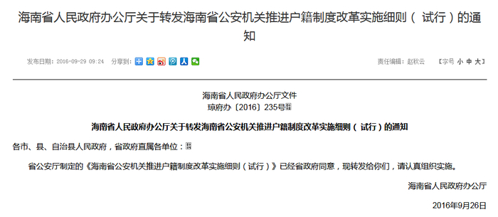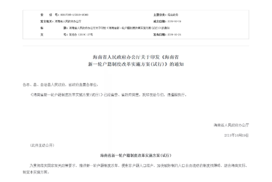 10月25日,海南省政府网站发布海南省人民政府办公厅关于印发《海南省新一轮户籍制度改革方案(试行)》(后简称为《方案》)的通知,其中取消全省(除三沙市外)的落户限制。