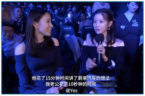 “你老公来我们家,跟我和强东一起吃了顿饭,他花了15分钟来介绍他对蔚来汽车的想法,我老公花了10秒钟的时间说Yes”。