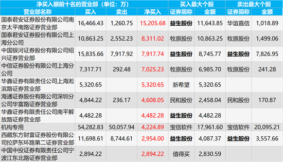 龙虎榜净买入金额前三的营业部是国泰君安南京太平南路证券营业部、国泰君安上海分公司、银河证券绍兴证券营业部,净买入金额分别为15205.68万元、8311.02万元、7917.74万元,买入金额最大的个股分别是益生股份、牧原股份、益生股份,所对应的买入金额分别为11643.85万元、10863.25万元、8745.77万元。