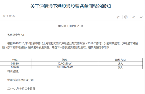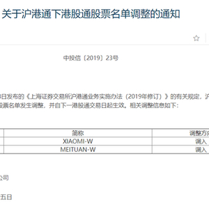 10月25日,上交所和深交所发布公告称,根据2019年10月18日发布的《深圳证券交易所深港通业务实施办法(2019年修订)》的有关规定,港股通股票名单发生调整,小米集团(01810.HK)和美团点评(03690.HK)获准调入港股通名单,并自下一港股通交易日即10月28日起生效。