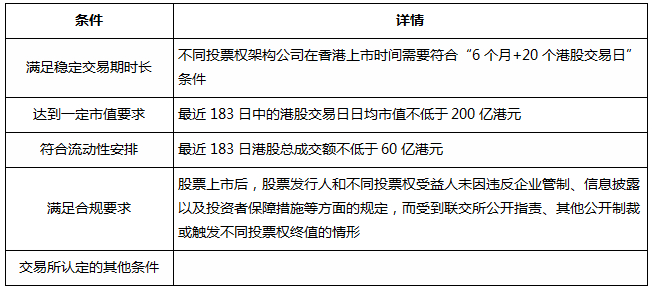 上交所和深交所均规定,不属于上述类别而又具有不同投票权架构的公司股票,在首次纳入港股通股票时还应当同时满足下列条件。