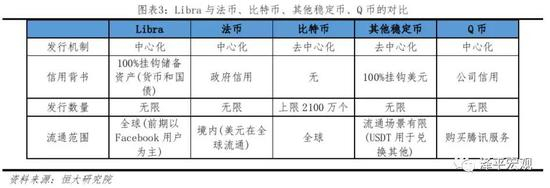 1)发行机制方面,Libra是中心化的,即由Libra协会制定管理发行规则,这不同于比特币、稳定币USDT等数字货币,但是与法币和Q比相类似。
