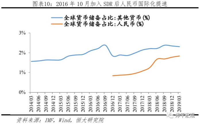 SDR(特别提款权)与Libra高度相似,我们可以从SDR来看Libra对人民币国际化的冲击。SDR同样由一篮子货币按比例构成,SDR可以用来偿付本国逆差和对IMF欠款,其与Libra唯一差异在于SDR仅用于国家间的贸易和债务结算,不可以作为企业和个人的支付手段。2016年10月1日,人民币正式加入SDR,所占权重为8.09%。从2016年10月起IMF开始披露人民币在全球货币储备中的总额,此前人民币仅纳入其他货币科目。2016年10月人民币占全球货币储备比例为0.84%,截至2019年3月该比例已达1.84%,而在2015年6月包含人民币的其他货币占比仅为1.89%。事实上,SDR占全球央行货币储备份额极低,2014年末该占比仅为2.9%,不过人民币纳入SDR带动了各国对人民币的储备需求,人民币国际化进程明显提速。由人民币纳入SDR事例可推演Libra对人民币国际化的冲击,即如果Libra未将人民币纳入抵押货币,且Libra在全球范围内流通,人民币国际化将受阻,反之则会助推人民币国际化。