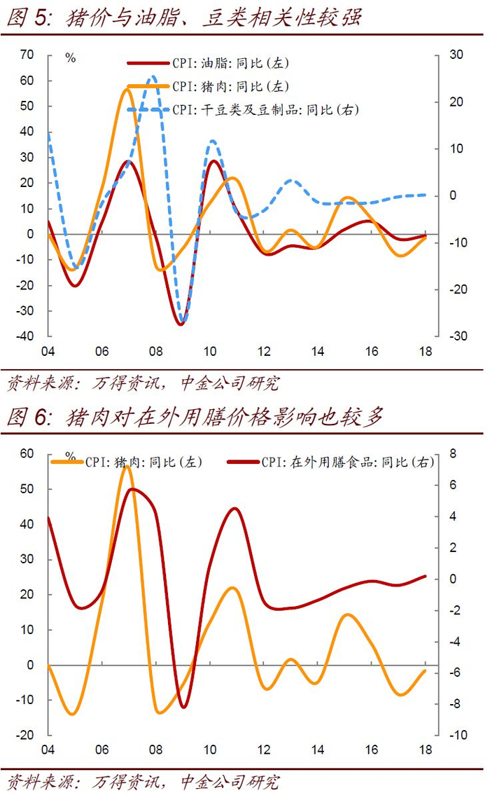在猪肉价格的推动下,CPI食品项仍在逼近历史高点的通道中。有了猪肉的价格序列,我们再对CPI食品项进行预测。在预测CPI的过程中,就单一因素而言,相对容易说清楚其与CPI 的关系。但在进行CPI 预测时,还无法把这些因素都作为模型输入变量来预测CPI,因为这些因素自身之间都或多或少的存在相关性,这种共线性可能导致这些输入变量在模型中对CPI 的影响权重变得不稳定。而且对很多因素的走势进行预测反而可能使得模型预测的精度下降。因此,在进行CPI 整体的综合判断时,并非分析因素越多越好,尽量简化模型的输入变量可能使得预测的可靠性反而更高,统计上的简化办法是对CPI所有分项作主成分分析,但是对于主成分的解释可能存在问题。我们倾向于从经济学意义上去寻找简化输入变量,并把握对这些简化输入变量的预估。从理论角度,由于粮食价格比较稳定,而水果蔬菜的供应周期较短,影响食品CPI更多的是猪肉这类供应周期较长的商品;从中国人的消费篮子看,猪肉的权重也相当之高。央行在07Q2的报告也提到过,肉类供应增加存在一定周期,如果伴随生猪饲养成本上升,肉价维持高位的时间可能会比较长,并容易波及其他食品价格,那是央行第一次关注到猪周期。通过比价效应,猪肉与其他肉类相关性无疑较强,近期鸡肉零售价格从7月中的12.2元/斤已经上行至13.6元/斤。从猪价上涨对其他非肉类食品价格的影响渠道看,主要是通过豆油、油脂、餐饮服务。历史上,猪价与油脂、豆类和在外用膳价格的相关性较强,但是近期相关性有所减弱(图5、6)。从实证角度,猪肉和非猪肉的食品在历史上也确实有共振效应,系数估算是0.25,即100%的猪价涨幅对应25%的非猪肉类食品涨幅。